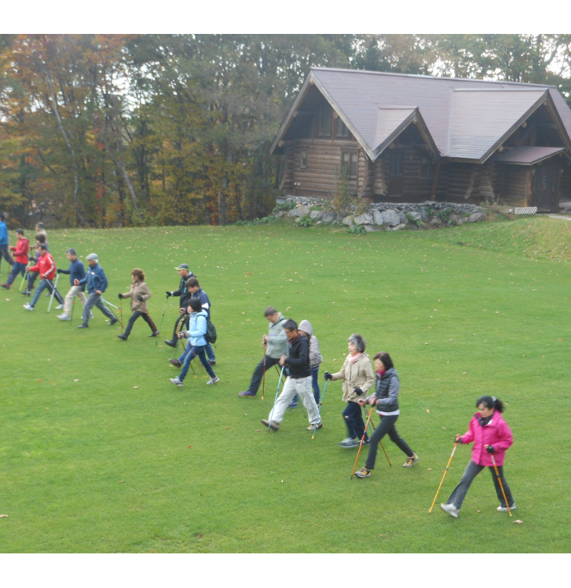 イベントの締めくくりは「ダボスの丘」をウォーキング。菅平高原は、スイスのダボスを思わせる気候や環境から、「日本のダボス」と呼ばれています。冬はスキー場に囲まれるこの地域も、この季節は紅葉がこれから始まるところ。アスファルトではない芝の道を上り下りし、楽な歩き方を実感いただきます。