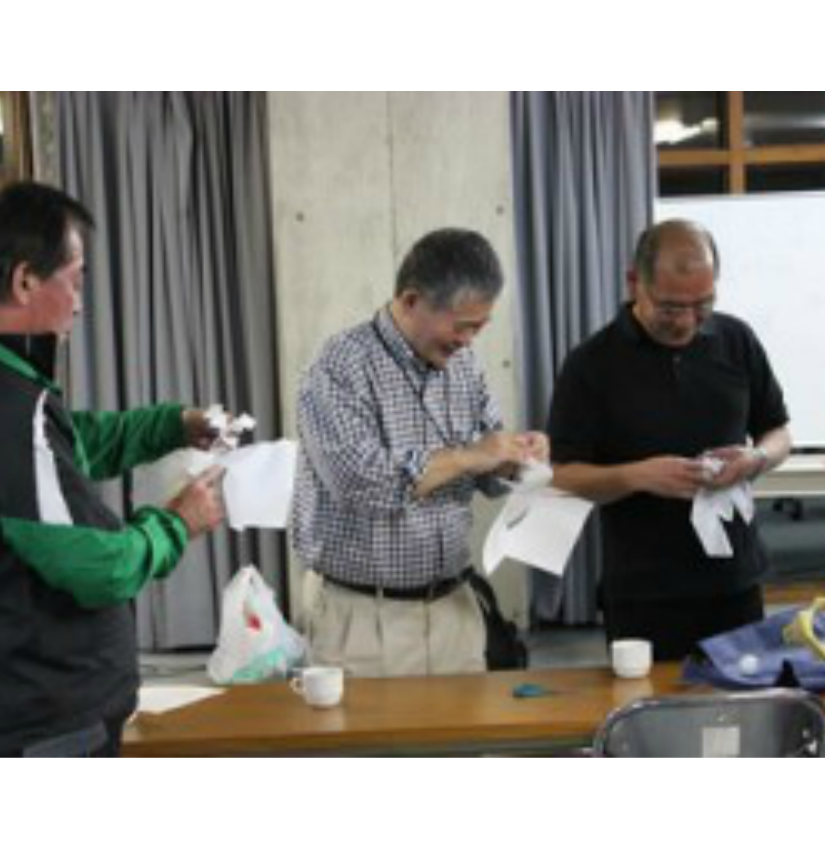 夕食後は「折り紙」の骨盤です。一枚の紙を折って骨盤に作りあげることで、骨盤の構造を理解します。ハサミを手に、それぞれが考えながら、また子供のころを思い出して折り紙を楽しみながら、構造を理解できるようになっていきます。